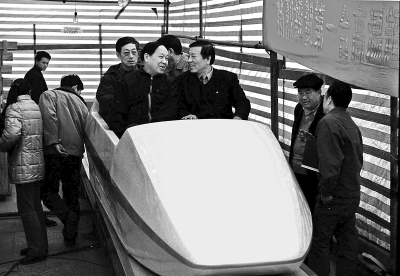 | 2001年2月10日,“高温超导磁悬浮试验车”在四川成都西南交通大学正式通过国家级验收,该课题责任专家赵忠贤(前右)兴奋地登上实验车。尹钢摄/光明图片/视觉中国 |