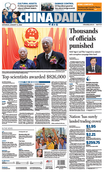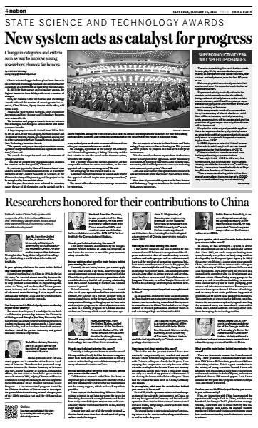 Top scientists awarded $826,000 Two scientists, nuclear weapons expert Cheng Kaijia and physical chemist Zhang Cunhao, won China’s top science award on Friday for their outstanding contributions to scientific and technological innovation. The pair, both members of the Chinese Academy of Sciences, were presented with certificates by President Xi Jinping at an annual ceremony honoring distinguished scientists and research achievements. They each won an award of 5 million yuan ($826,000). Addressing the ceremony, Premier Li Keqiang said, “China has entered a new stage in which the country must rely more on science and technological innovation to guide and support its economic development and social progress.” The nation’s traditional growth pattern, mainly driven by investment, is difficult to sustain, Li said. Eight foreign scientists from Italy, the United States, Germany, Russia and Canada won the International Science and Technology Cooperation Award. Meanwhile, 313 scientific research projects received the 2013 State science and technology awards. One highlight of this year’s awards was that a first-prize winner was found for the State Natural Sciences Award — which recognizes major breakthroughs in fundamental research — after a gap of three years. The award was given to the discovery of iron-based high temperature superconductors, a project conducted by scientists from the Institute of Physics under the Chinese Academy of Sciences and other institutions. Superconductivity basically refers to the electrical resistance of a material suddenly being reduced to zero under certain circumstances, said Zhao Zhongxian, a superconductivity physicist and member of the Chinese Academy of Sciences. Components made from superconductors can help to improve the accuracy of atomic clocks on satellites, accelerate central processing units on computers, and increase the precision of gyroscopes on navigational devices. “Many excellent scientists contributed to the research on superconductivity in China, and it is hard to tell whether we would have reached this point without any one of them,” Zhao said. “In China, we have a good research tradition on superconductivity, and we have talent of all ages. China has become a rising power in condensed matter physics,” he added. In 2009, the research and compilation of Flora of China, a scientific publication aimed at describing plants native to China, won first prize in the State Natural Sciences Award. The project marked collaborative efforts by Chinese scientists to publish the first modern English language account of some 31,000 important plants and 7,500 species of trees and shrubs.