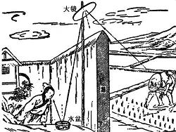 刘安的《准南子》记载用冰作透镜,用反射镜作潜望镜等奇妙的光学现象。记得初中物理有道脑筋急转弯式的考题:在南极没有火柴怎么生火?答案是把冰磨成凸透镜聚光到易燃物上就可以。这就是古代中国人的智慧,而潜望镜则可以用来观察院子外面的情况(如下图)。只是可惜,中国人没有发明潜水艇并把它用上去,要不中国肯定称霸海上世界!