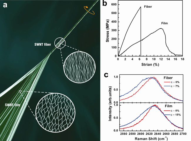 | 图1.宏观碳纳米管薄膜及纤维的微观结构与力学性质。a)宏观碳纳米管薄膜及纤维的微观结构。b)宏观碳纳米管薄膜及纤维的拉伸曲线。c)宏观碳纳米管薄膜及纤维在应力下的拉曼光谱。 |