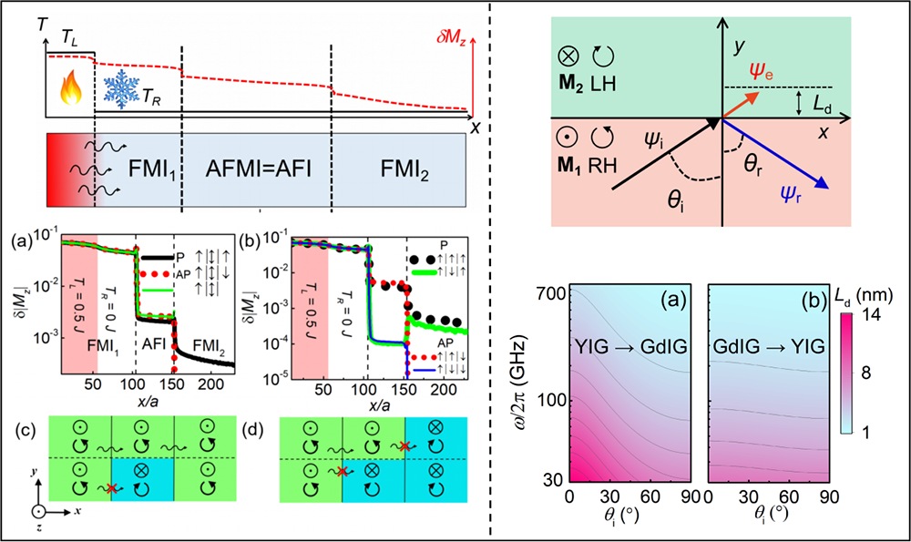 图1. 左图:磁子结的构造和磁子阻塞效应(MBE)示意图;(a)不同磁结构时磁子浓度的空间分布;(b)通道分辨的磁子浓度空间分布;磁子结在平行态(c)和反平行态(d)下的磁子输运示意图,磁矩方向相反的界面发生磁子阻塞效应,磁矩方向相同的界面磁子可以部分透射。右图:磁子趋肤效应(MSE)示意图。介质1(2)的磁矩方向沿+z(-z)方向,允许右(左)旋圆偏振自旋波的传播。当自旋波从右旋介质1进入左旋介质2时,介质2中的波为衰减波,其衰减长度为Ld。(b)自旋波从YIG进入GdIG时,Ld随频率ω和入射角θi的变化。(c)自旋波从GdIG进入YIG时,Ld随频率ω和入射角θi的变化。