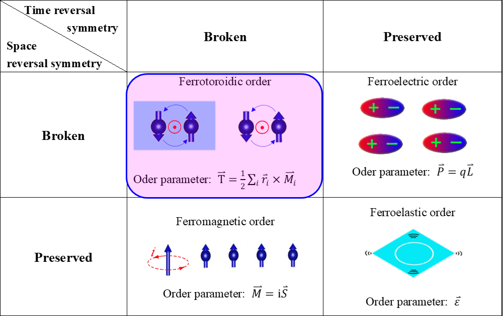 图1、铁涡序(左上)、铁电序(右上)、铁磁序(左下)和铁弹序(右下)等四种基本铁性有序相变及相应的时空对称破缺