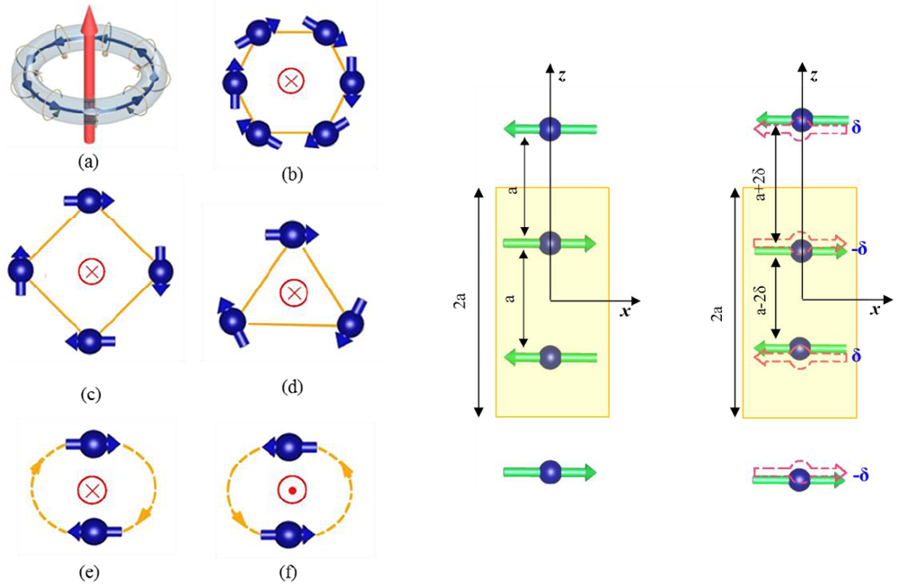 图2、由磁矩首尾相接构成铁涡矩(a)沿圆环面流动电流产生铁涡矩;(b-d)分别由6、4和3个磁矩构成的铁涡矩;(e-f)由2个磁矩构成的方向相反的铁涡矩。(g)自旋均匀排列的反铁磁链,其空间和时间反演对称性均未破缺,不存在铁涡性。(h)自旋结构二聚化且反铁磁排列的自旋链,理论预测的一维铁涡链模型。