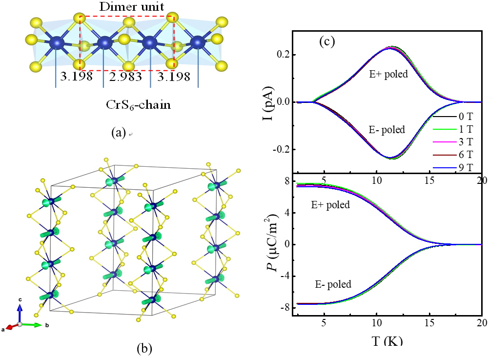 图3、(a)Ba6Cr2S10晶体结构中二聚化的CrS6自旋链。(b)Ba6Cr2S10磁结构。(c)电极化实验测量结果。