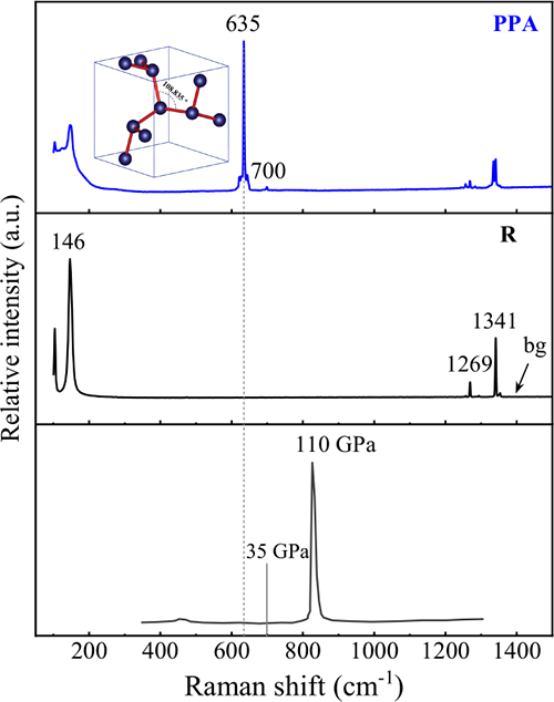 图1.原子氮聚合物 (cg-N) 的类金刚石立方结构和对应的拉曼谱