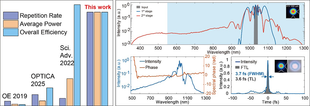 图 不同单周期脉冲压缩方案的关键指标对比(左),超连续白光光谱展宽(右上),接近变换极限的单周期飞秒脉冲压缩结果(右下)