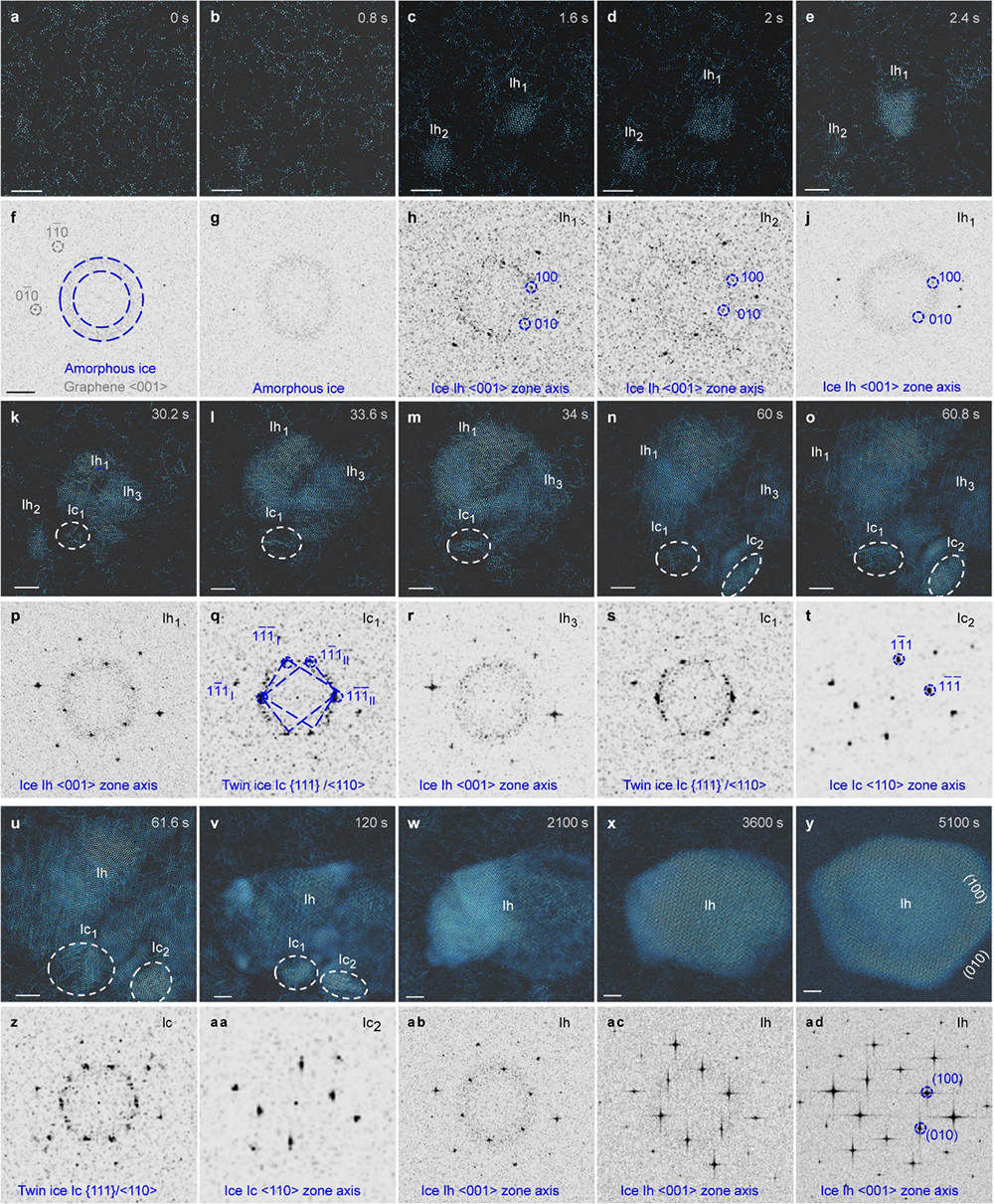 最近,该团队在发现立方冰工作的基础上[Nature 617,86 (2023)],在冰异质成核结晶机制研究中又取得重要进展。他们利用自主发展的原子分辨原位冷冻电镜技术,通过实时观测和统计,揭示了低压水蒸气在低温石墨烯界面的成核结晶动力学路径。研究发现,在低温(100 K)与低压(10⁻⁵Pa)环境下,亚稳态立方冰与热力学稳定态六方冰可各自独立直接成核,随后在表面能主导下经历晶核聚集、取向一致和熟化,最终形成以低指数面裸露为特征的多晶型成熟晶粒。该工作首次证明了在远离平衡态的极端条件下,冰能够通过非经典的直接成核路径实现结晶,其过程主要受长程周期性构型焓变驱动的量子相变动力学主导,而经典粒子动能的作用相对次要。这一结果为冰结晶动力学调控提供了微观机制,也为凝聚态物质的结晶相变研究提供了新的参考依据。