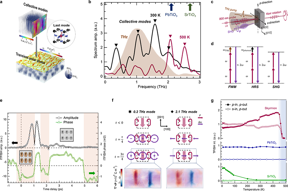 图:太赫兹脉冲激发下斯格明子的集体动力学模式与瞬态极性相。(a)通过太赫兹共振激发集体振荡模式诱导瞬态极性相示意图。(b)斯格明子集体振荡模式的动力学相场模拟结果。(c)测试装置示意图。(d)瞬态二次谐波响应的理论模型。(e)干涉式太赫兹场致二次谐波(iTFISH)测量结果。(f)集体振荡模式的空间运动模式模拟结果。(g)斯格明子太赫兹动力学的温度稳定性。
