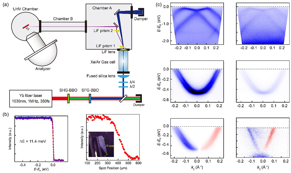 图. (a) 系统示意图。(b) ARPES能量分辨率测量与光斑形状大小测量。(c) 多种材料体系在不同偏振光下的ARPES测量结果。