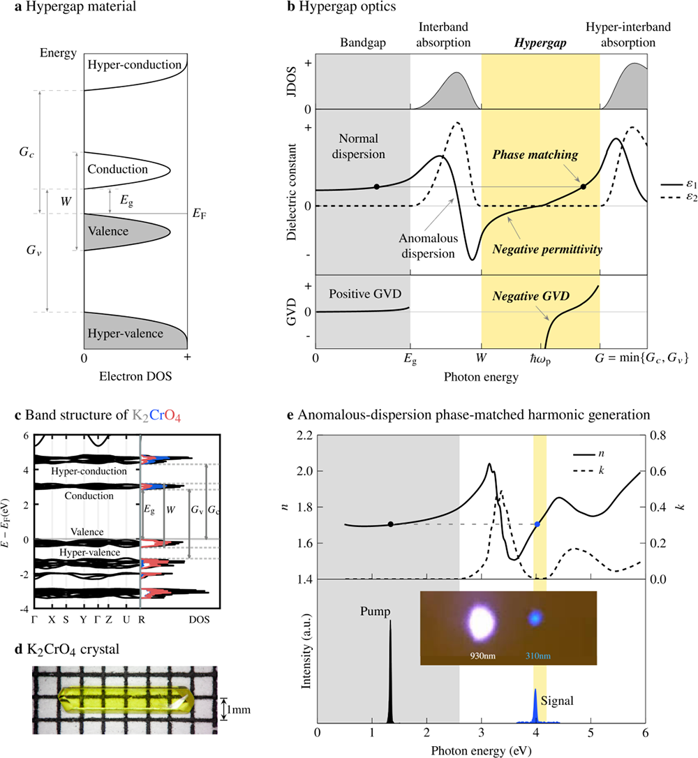 图1: a 超带隙材料电子态密度。b 超带隙光学材料的电子联合态密度、反常光学介电常数、与反常群速度色散的示意图。带隙能量为Eg,超带隙能量范围是W~G。 c 铬酸钾能带与态密度。d 铬酸钾晶体照片。e 铬酸钾折射率的实部与虚部,泵浦信号与三倍频的光谱和光斑。