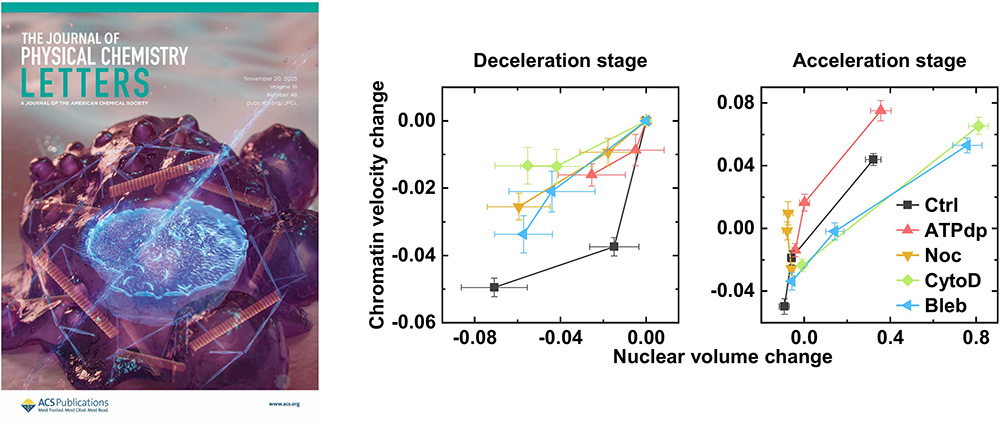 该工作以“Mechanically Regulated Biphasic Chromatin Dynamics during Cellular Necrosis”为题发表于Journal of Physical Chemistry Letters,并被选为其增刊封面。物理所的窦硕星研究员和北师大的李辉教授为共同通讯作者,物理所博士生魏坦琳为第一作者。研究得到了国家自然科学基金、中央高校基本科研业务费和中国科学院的支持。