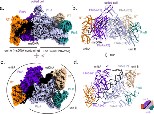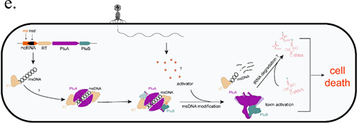逆转录子(Retron)是细菌体内重要的免疫系统组成部分,能利用自身逆转录酶(RT)合成一种独特的RNA-DNA杂交分子(msDNA)。此前研究表明,一些逆转录系统与特定的效应蛋白结合,形成“毒素-抗毒素”对,当细菌检测到噬菌体入侵时,逆转录系统被激活,毒素释放以清除受感染的细胞,从而保护细菌群体。