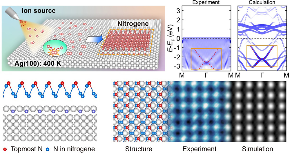 中国科学院物理研究所/北京凝聚态物理国家研究中心表面物理国家重点实验室 SF09 组的冯宝杰研究、吴克辉研究员(现钱塘高等研究院)、陈岚研究员长期从事低维合成材料的实验研究,制备出了包括硅烯、硼烯等多种低维合成材料,在国际上引起了高度关注。最近,他们指导博士生胡学高、高志成等,发展了离子束辅助外延(ion-beam-assisted epitaxy)技术,在Ag(100) 金属衬底上成功制备出了氮烯。他们利用扫描隧道显微镜(STM)、扫描隧道谱(STS)、角分辨光电子能谱(ARPES)、X射线光电子能谱(XPS)等实验技术,并且与SF10组孟胜研究员指导的博士生曹海军、周辉展开合作,结合第一性原理计算,确认了氮烯具有类黑磷的原子结构。