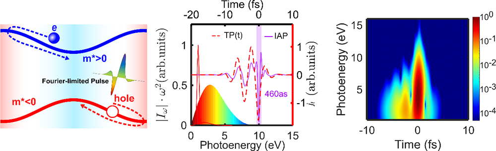 该方案的核心思想是基于固体高次谐波的“晶体自啁啾补偿”(crystal self-chirp compensation, CCC):在强激光场驱动下,电子–空穴波包在有效质量为正与为负的能带区间中分别积累符号相反的色散/啁啾,从而在谐波辐射时刻实现正负色散抵消为零。另一方面通过合成的光场波形进行量子轨道操控,从而形成超连续光谱辐射,产生脉宽约 460 as的孤立阿秒白光脉冲。同时提出了基于实验室普遍使用的多周期、多色激光场对离散时间平移对称的破缺与量子轨道操控,实现了约 640 as 的孤立阿秒脉冲,并发现其脉宽不依赖载波相位的变化。总体而言,该工作为桌面级孤立白光阿秒光源的实现提供了明确的设计路线,将极大推动面向价电子波包的阿秒电子动力学测量,以及谷/自旋/手性体系的阿秒尺度电子动力学操控。
