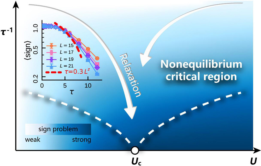 图1 通过短时临界动力学规避符号问题并探测量子临界性的示意图。量子临界点控制的标度行为在短时阶段就已经出现,而此时的符号问题通常较弱。