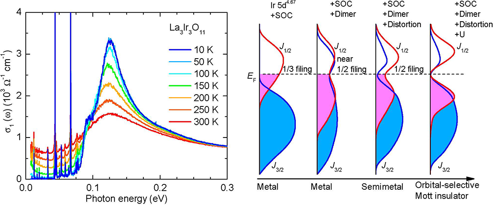 图: La₃Ir₃O₁₁中的光学激发特征和轨道选择性Mott绝缘态的形成示意图。