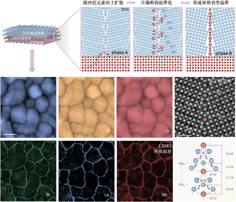 针对铁电亚稳相稳定这一长期未解决的科学难题,中国科学院物理研究所/北京凝聚态物理国家研究中心研究团队通过深入结构研究发现,铁电薄膜中大量存在的晶界,潜藏着调控物相稳定性的巨大潜力。他们采用借助脉冲激光沉积技术、先进透射电子显微技术等综合手段,系统研究了晶界的原子结构及其对铁电相稳定的调控机制,最终揭示出缓冲层中的La、Sr、Mn元素会向ZrO₂薄膜内扩散,且仅选择性富集于晶界区域,晶粒内部无明显扩散,进而在晶界处形成了原子级锐利、化学高度有序的La(Sr)-Mn-O异质结构。