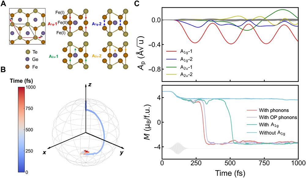 最近,中国科学院物理研究所/北京凝聚态物理国家研究中心表面物理国家重点实验室博士生武娜(现为德国马普所博士后)、王恩等人在王亚娴副研究员、孟胜研究员的指导下,利用自主发展的实时含时密度泛函理论和Ehrenfest分子动力学相结合的方法,系统研究了二维巡游铁磁体 Fe₃GeTe₂中光诱导的超快自旋动力学过程,在理论上成功实现了飞秒尺度的光诱导自旋翻转,并揭示了相干声子在其中的关键作用机制。研究发现,在近红外激光激发条件下,体系磁矩可在约300飞秒时间尺度内发生翻转;同时随着激光强度变化,体系可进入退磁、自旋翻转以及自旋熔化三种不同的磁动力学调控区域,建立了全光学调控磁相变的相图。