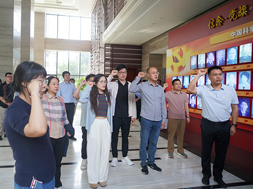 在所史教育和党员主题教育环节,新职工观看了95周年所庆主题文化活动视频和物理所文化形象宣传片,参观了所史馆和党员主题教育基地,观看了科学家视频。该环节不仅帮助新职工快速加深了对物理所文化底蕴的认知,更让他们深刻学习和感悟了老一辈科学家身上 “对党忠诚、追求真理、勇于担当” 的宝贵科学家精神。党员代表郭建刚研究员作为领誓人,带领新职工党员在党员院士墙前面对党旗重温入党誓词,大家内心激动不已。