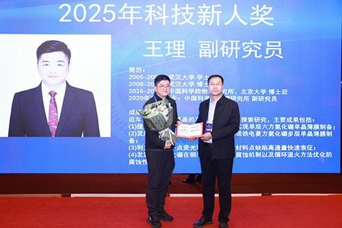 程金光为2025年秋季“科技新人奖”获得者王理副研究员颁奖,以表彰他在二维单晶的可控制备与应用探索研究方面做的重要工作。随后,王理向与会人员作了题为“Controlled Growth and Property of Two-dimensional Boron Nitride Crystals”的报告。